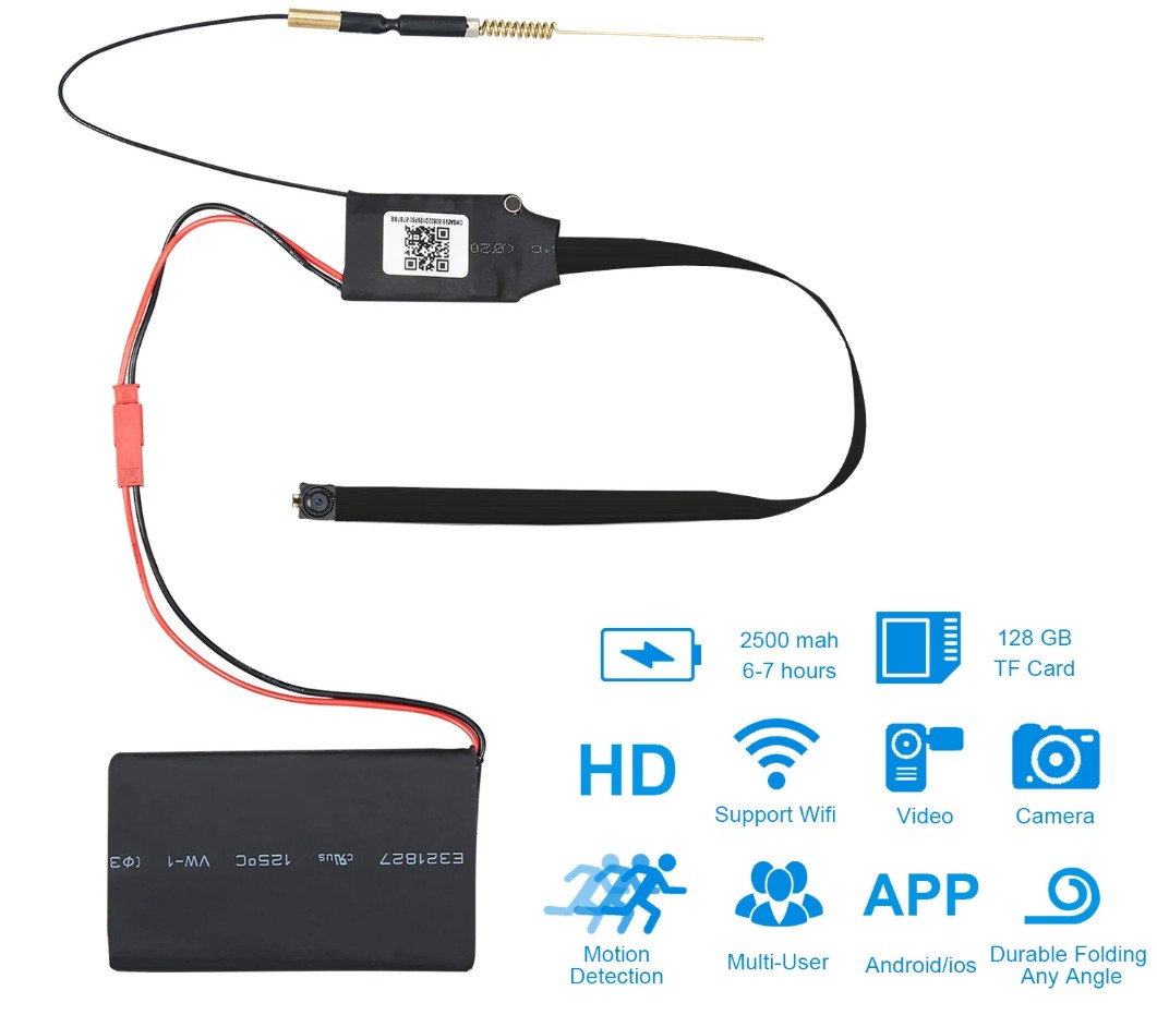 Wifi-enabled. Motion detection. Micro-SD card slot. This is a very versatile unit. Can be concealed in a variety of objects, in boxes, overhead flourescent light fixtures, behind walls, etc.